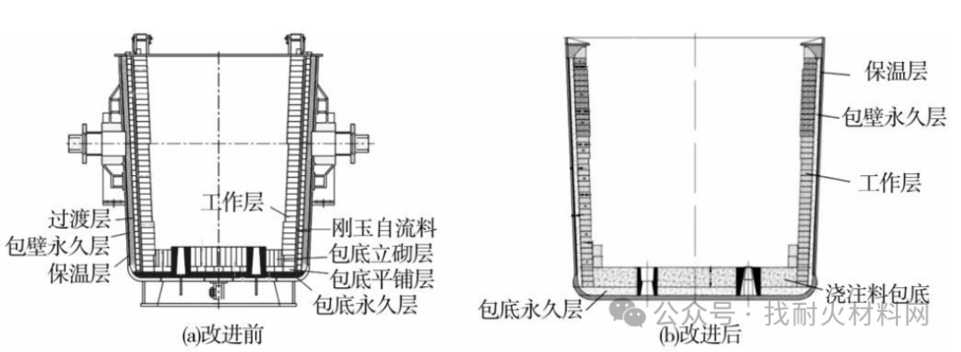 包壁設(shè)計:根據(jù)當前的實際情況,確定通過減少鋼包砌磚厚度擴大鋼包內(nèi)徑的方案來實現(xiàn)擴容,去掉修包壁過渡層使用80mm保溫磚,去掉包壁過渡層和工作層之間40mm剛玉自流料,鋼包擴容后取消包沿磚,使用渣線磚代替,否則凈空不能滿足精煉要求。經(jīng)計算,鋼包凈空高度為400mm時,鋼包容量為132t,達到了優(yōu)化設(shè)計的要求,滿足了盛裝130t鋼水裝入量的生產(chǎn)需求。原始設(shè)計方案和改進后設(shè)計方案見圖1。