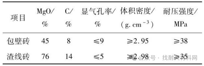 鋼包包壁磚采用200mm厚的鋁鎂碳磚,要求碳含量提高2%,即含碳量為8%。渣線磚采用240mm厚的鎂碳磚,要求磚中碳含量提高2%,即含碳量為14%,以提高磚的抗浸蝕能力。鋼包磚的理化指標見表1。