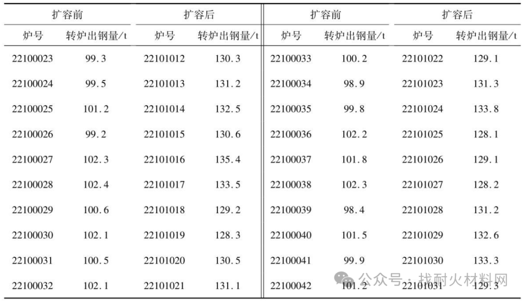表2為鋼包擴容前、后各20爐的轉(zhuǎn)爐出鋼量。從表2中可以看出通過鋼包修砌工藝的調(diào)整改進,擴容前20爐平均轉(zhuǎn)爐出鋼量為100.77t,擴容后20爐平均轉(zhuǎn)爐出鋼量為130.93t,平均轉(zhuǎn)爐出鋼量較擴容前增加了30t左右,達到了預定目標。