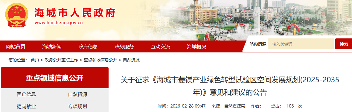關(guān)于征求《海城市菱鎂產(chǎn)業(yè)綠色轉(zhuǎn)型試驗(yàn)區(qū)空間發(fā)展規(guī)劃(2025-2035年)》意見(jiàn)和建議的公告