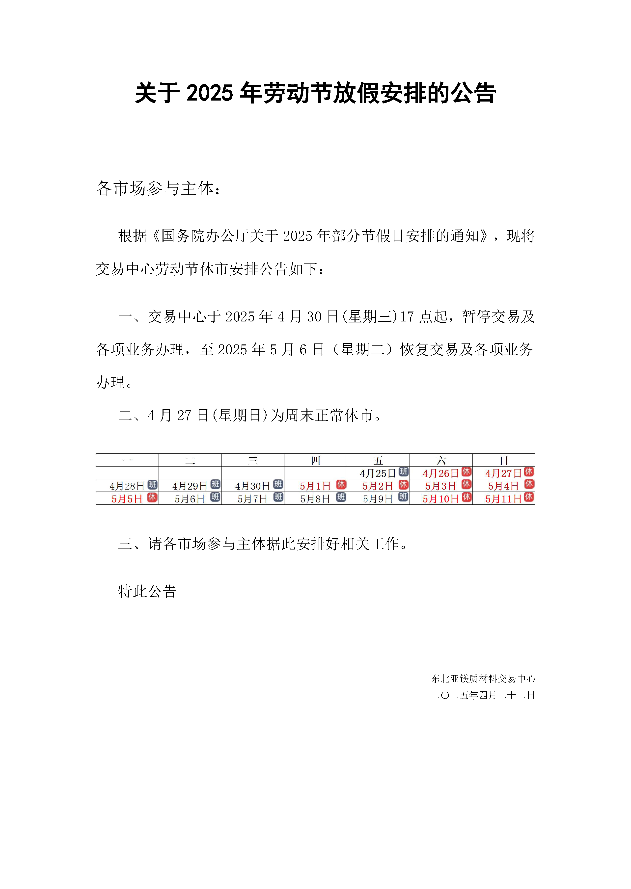 關(guān)于2025年勞動節(jié)放假安排的通知